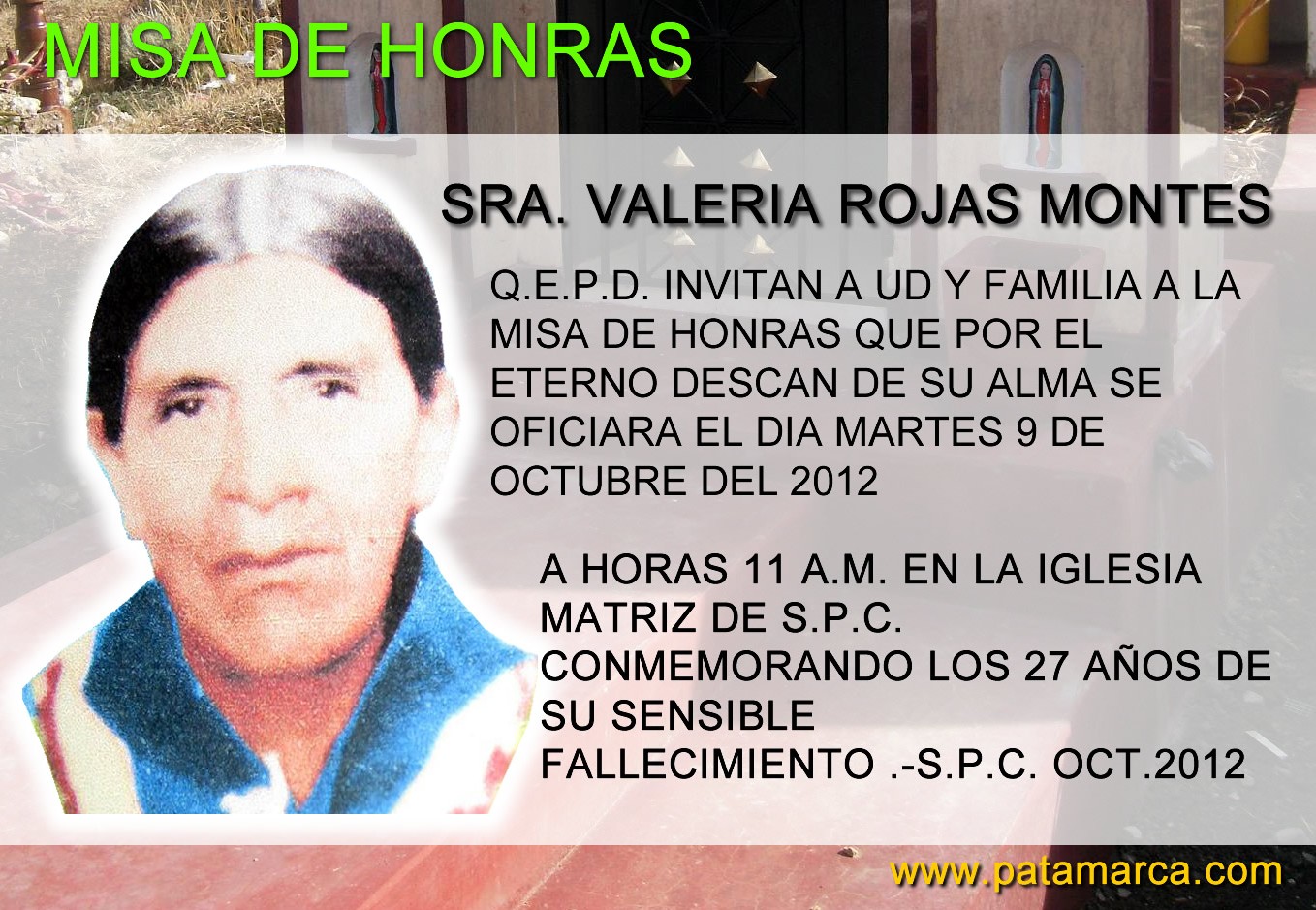 CONMEMORANDO LOS 27 AÑOS DE SU SENSIBLE FALLECIMIENTO .-S.P.C. OCT.2012 NOTA: DESPUÉS DE LA MISA SÍRVASE ACOMPAÑARNOS AL CEMENTERIO GENERAL Y LUEGO PASAR A LA CASA UBICADO EN LA CALLE GRAU S/N BARRIO CUARTO,S.P.C.