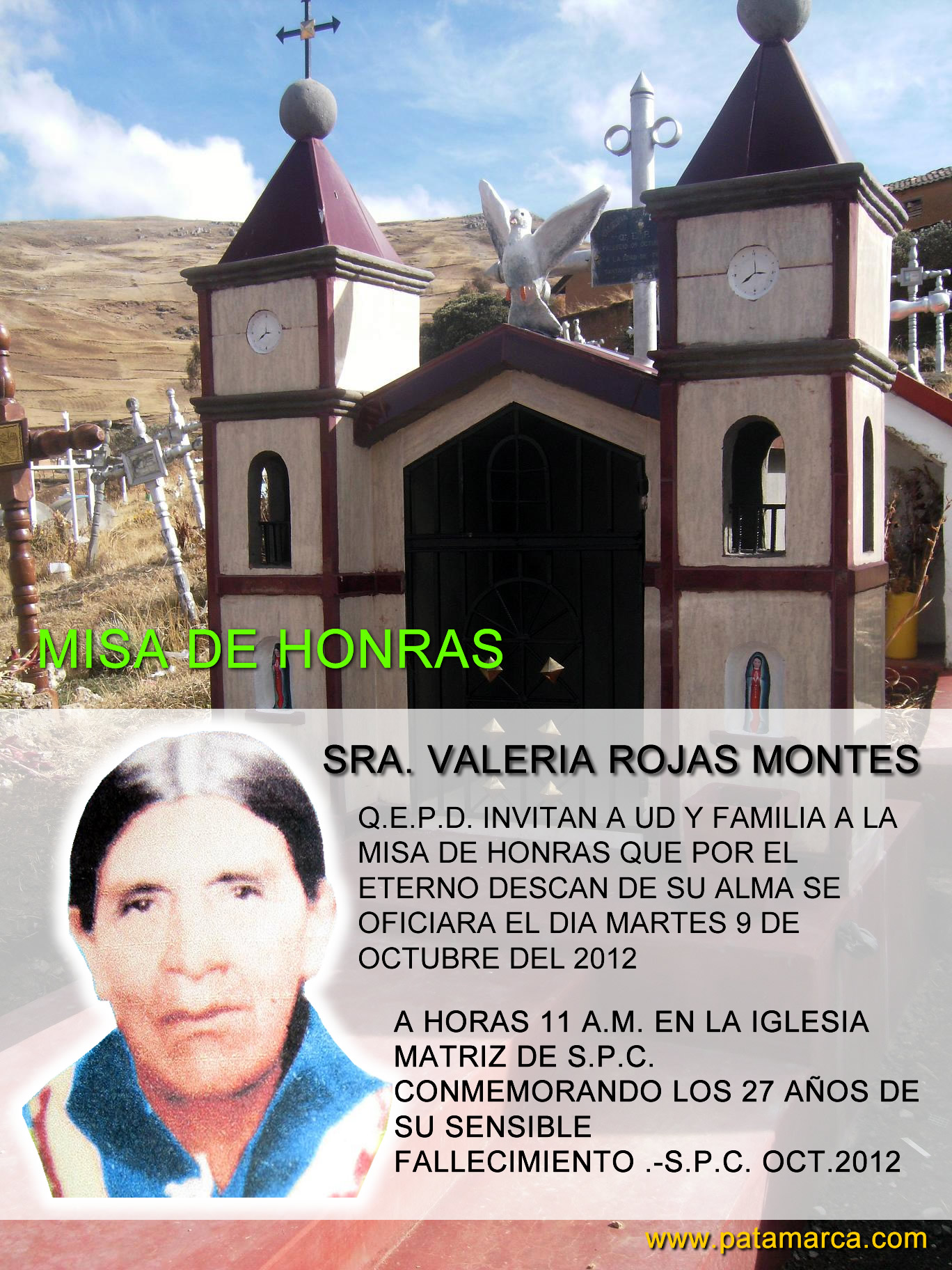 MAMA NOS DEJASTE TU EJEMPLO DE ABNEGACIÓN, BONDAD Y SACRIFICIO PARA LAS PERSONAS QUE AMASTE PERO TAMBIÉN DEJASTE UN VACIÓ TAN GRANDE CON TU PARTIDA,PORQUE LAS PERSONAS QUE SIEMPRE TE AMAREMOS TENEMOS LA CONVICCIÓN QUE TU ESTARÁS AQUÍ PRESENTE CON NOSOTROS EN CADA MOMENTO DE NUESTRAS VIDAS». SU NIETO SR. MIGUEL VILCHEZ PALOMINO Y FAMILIA DE LA QUE EN VIDA FUE SRA. VALERIA ROJAS MONTES Q.E.P.D. INVITAN A UD Y FAMILIA A LA MISA DE HONRAS QUE POR EL ETERNO DESCANSO DE SU ALMA SE OFICIARA EL DÍA MARTES 9 DE OCTUBRE DEL 2012 A HORAS 11 A.M. EN LA IGLESIA MATRIZ DE S.P.C.